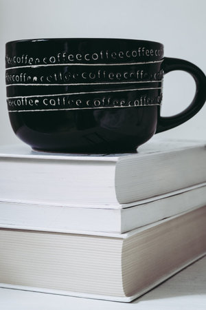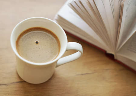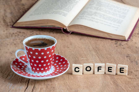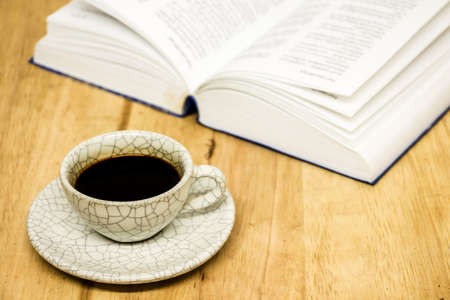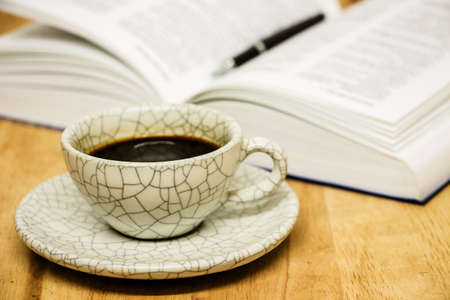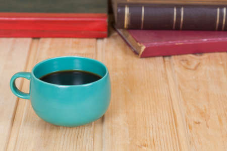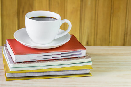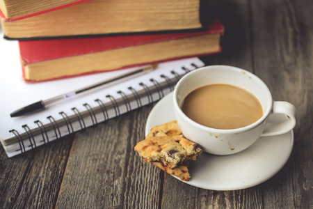 Stack of Book and Cookies with Hot Coffee on Dirty Cup on Wood Background with Copy Space