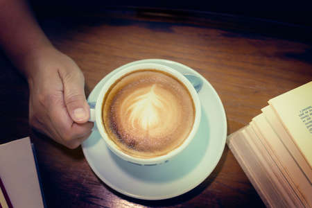 coffee latte art on wood table, relax time, cafe barista art top view.