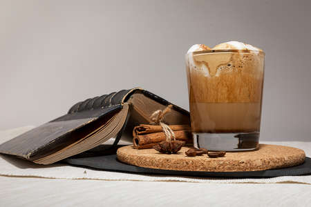 Dalgon coffee in a glass Cup on a cork stand next to a book, cinnamon, coffee beans and badyan on a black stone tray on a light background.