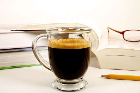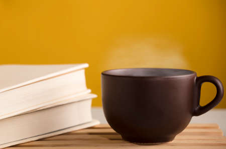 Brown cup of coffee or tea with hot steam, on the table, with books, glasses and brown background.