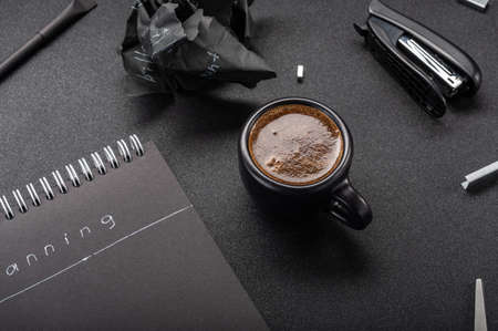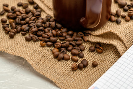 a cup of coffee with scattered grains on a burlap next to a notebook coffee beans close-up. High quality photo