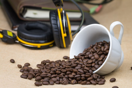 Roasted coffee beans In a white cup of coffee on its side and a lot of coffee on the ground and a notebook and music headphones Placed behind the picture and the bottom surface is a brown fabric