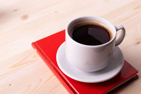 Closeup black coffee in takeaway cup on the desk with opened notebook and book