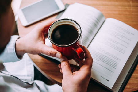 Cup of hot coffee, plaid and books on table. Education concept. Selective focus