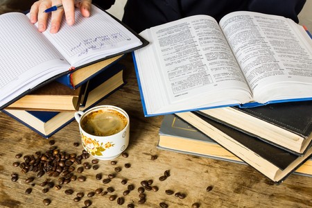 Girl sitting at a table under a stack of books next to a cup of black coffee and coffee beans glasses and notepad