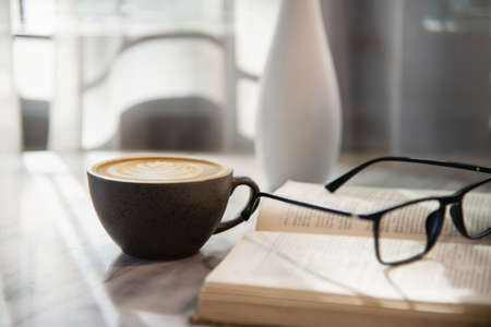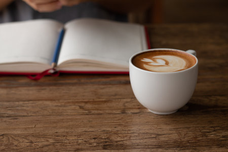 Cappuccino coffee cup with decorative flowers and opened book on table