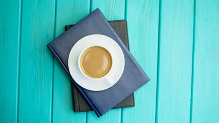 A notebook and pen, a cup of coffee, are stacked on a blue background. Soft leather cover and paper handle The topic of business and education.