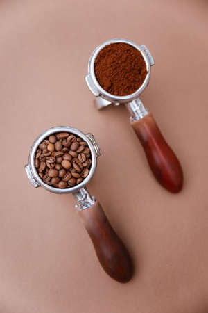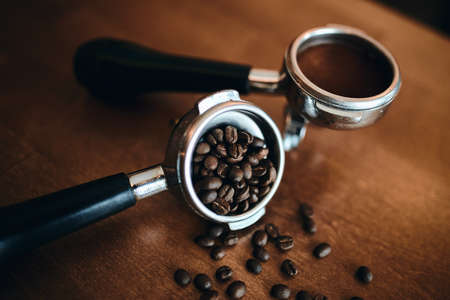 Coffee filter holders for coffee machine with beans and coffee ground on wooden table