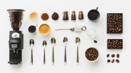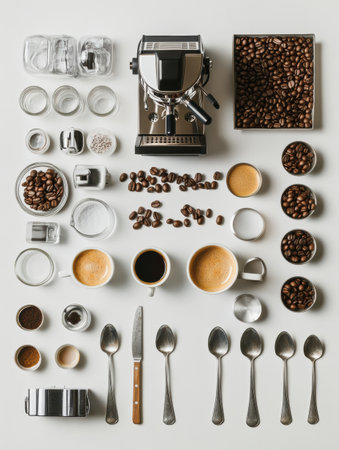 Flat lay composition features coffee beans, cups, spoons, and a coffee maker, all set against a clean, white background for creative use.