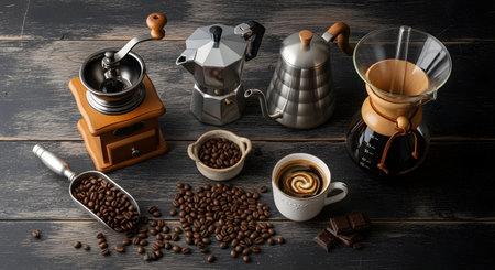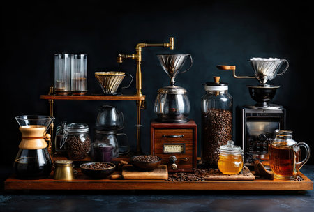 An assortment of coffee brewing apparatuses are arranged on a wooden surface against a dark background. The scene showcases glass carafes, metallic filters, and storage jars filled with coffee beans. The composition features rich colors and textures, suggesting an indoor setting. This image is suitable for commercial uses related to coffee, beverages, and culinary themes.