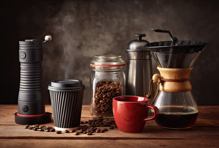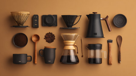 A visually appealing coffee brewing arrangement showcasing an elegant variety of coffee tools and accessories, perfect for coffee lovers and lifestyle enthusiasts.