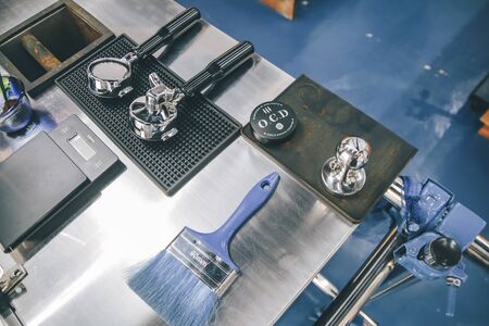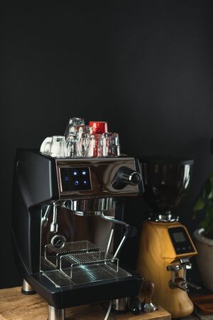 Cafe shop bar and counter with coffee equipment.Professional hot drink maker. Interior of shop restaurant. Coffee machine in cafe,Espresso coffee machine, coffee grinder,cups for drink preparation