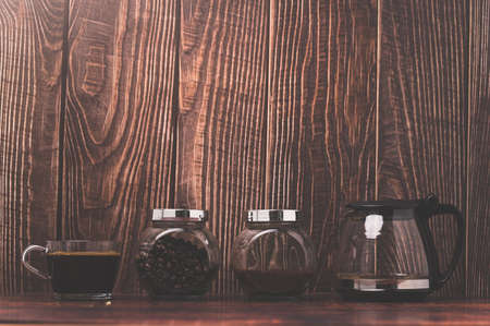 Black Coffee cup with coffee dripper and Coffee Drip Brew pot on wooden table