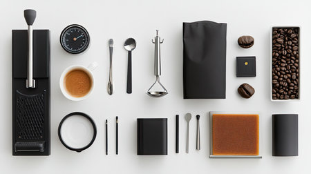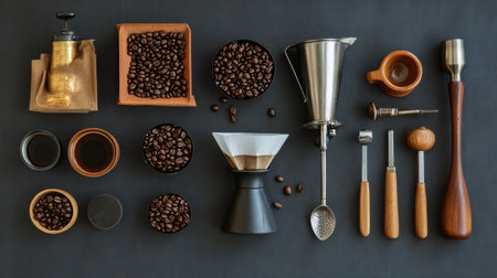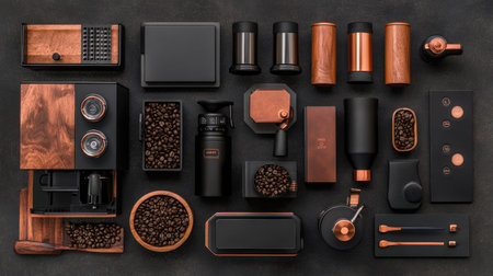 Discover a beautifully arranged set of coffee accessories showcasing various equipment in an elegant layout. Perfect for coffee lovers looking to elevate their brewing experience.