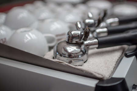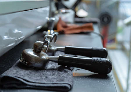 barista pick coffee bottomless portafilter to make a coffee at cafe. Coffee maker concept.