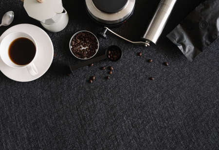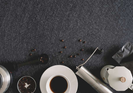 Aluminium moka pot and black coffee cup with coffee stuffs