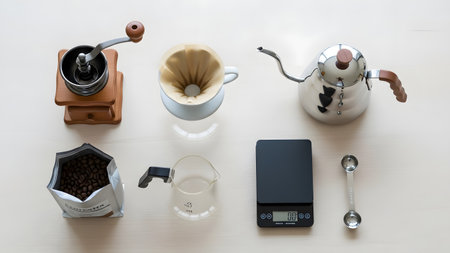 A stylish, minimalist coffee setup featuring essential brewing tools and accessories arranged on a clean surface. Ideal for coffee enthusiasts.