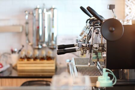 Professional coffee maker machine brewing fresh espresso coffee in cafe. blur image for background