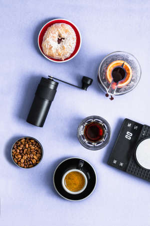Explore an elegant flatlay composition of coffee preparation tools and stylish accessories, showcasing the beauty of artisanal coffee brewing in a minimalist setting.