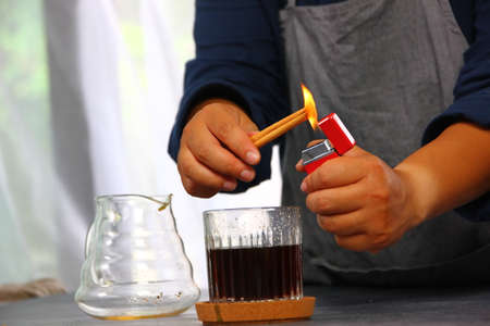 barista preparing cinnamon put on drip coffee make aroma coffee