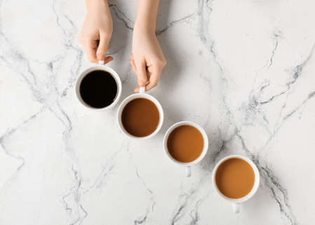 Female hands and cups of coffee on grunge background