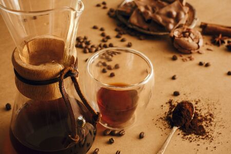 Making filter coffee in glass flask. Glass cup with fresh coffee, roasted beans, grounded coffee on spoon and macarons, chocolate and cinnamon on brown background. Coffee Essentials