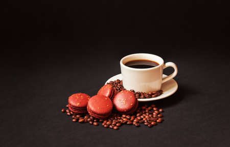 Coffee cup, chocolate macaroons and coffee beans on dark background. View with copy space.