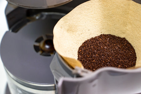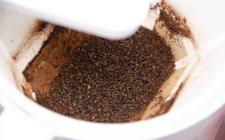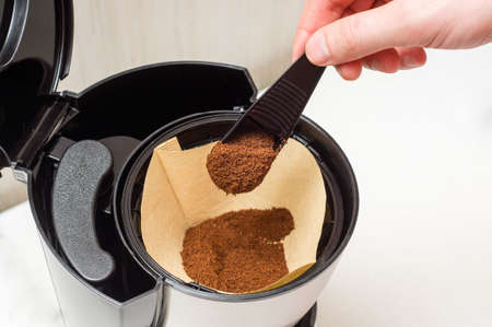 Process of making coffee from ground beans in a coffee maker - loading coffee into a paper filter