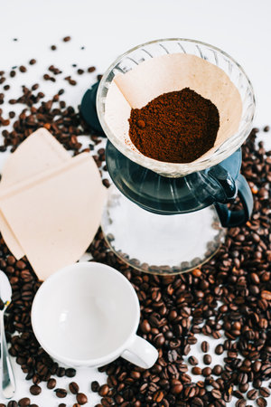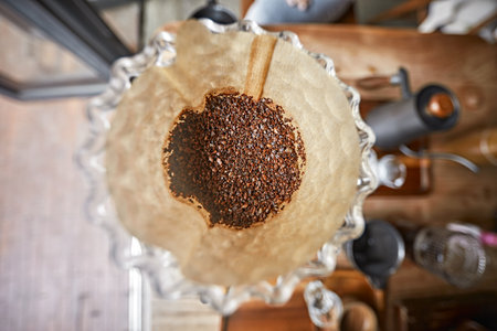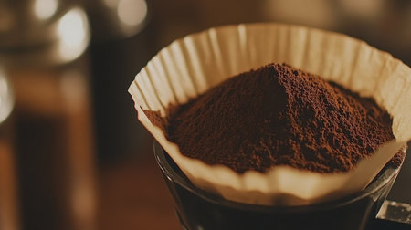 Rustic coffee brewing scene with ground coffee in filter on warm background