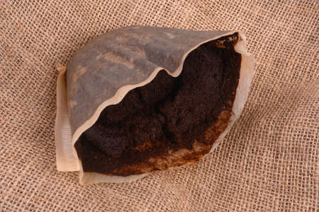 Used coffee grounds in a paper filter next to coffee beans close-up on burlap background