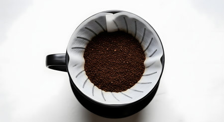A minimalist, top-down view of freshly ground coffee in a white paper filter, set inside a black pour-over dripper. The image is on a clean white background, highlighting the texture of the coffee grounds. This represents the process of brewing specialty coffee, cafe culture, and morning routines.