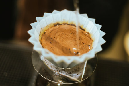 Coffee drip process by pouring hot water from kettle though ground berries bean with filter