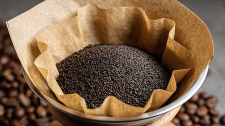 A detailed close-up of a coffee filter filled with grounds, showcasing the brewing process. The warm tones and textures evoke a cozy morning ritual.