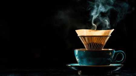 Elegant still life of coffee cup and filter bag, steam rising delicately in contrast to dark black background