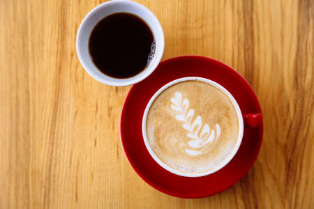 Aromatic coffee in a red cup with milk foam and latte art and freshly brewed coffee in a white cup on a light wooden table. Flat lay