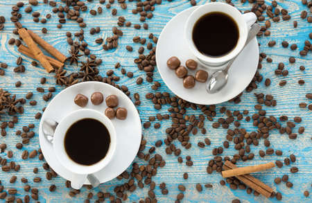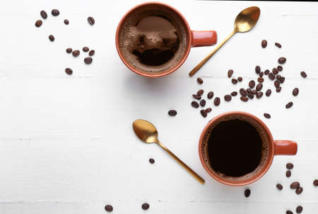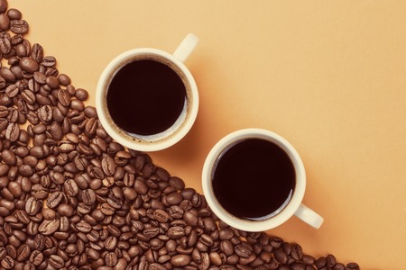 Cups of hot coffee and coffee beans. Top view flat lay. Brown wooden background.