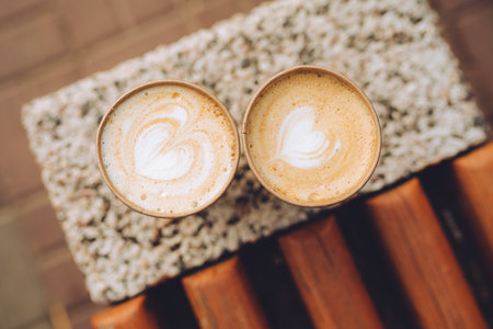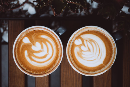 Two cups of coffee with heart latte art, date concept. Valentine's day or coffee lover theme. Couple of cappuccino cups on wooden background, top view, space for text. Romantic moments.