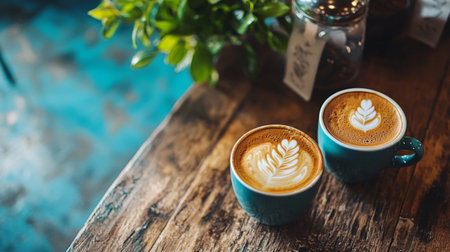 Close-up of two cups of coffee with intricate latte art, set on a rustic wooden table, evoking a cozy and inviting caf