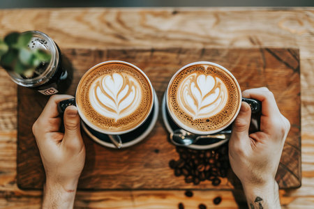 Two Hands Holding Coffee Cups with Latte Art, Enjoying a Moment Together on Rustic Wooden Table