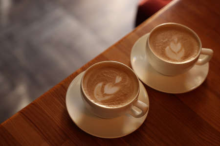 Two cups of fresh delicious cappuccino coffee with beautiful latte art on wooden background. From above, copy space.
