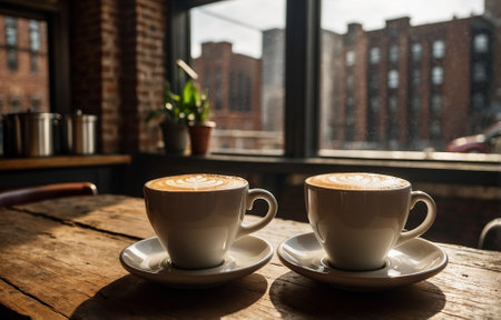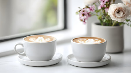 Two cappuccino cups with heart-shaped latte art sit on a table near a window, with flowers nearby, creating a serene atmosphere perfect for a cozy coffee break or gathering.