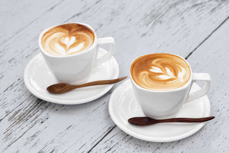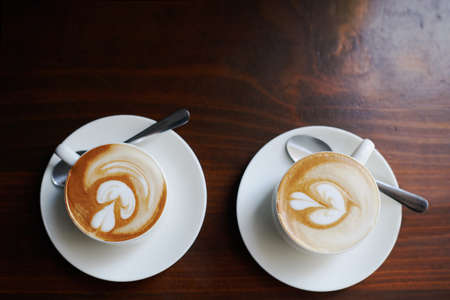 Two cups of coffee on brown vintage table with beautiful latte art. Top view