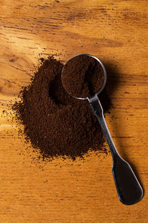 On a pile of ground aromatic coffee lies a silver teaspoon with a portion of coffee. Instant coffee in the morning. An invigorating drink.