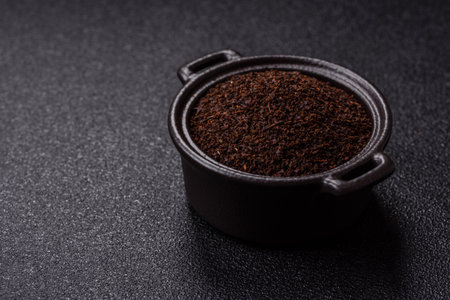 A breathtaking photo of ground coffee in a spoon on a black background. Aromatic morning coffee smell, aromatherapy.