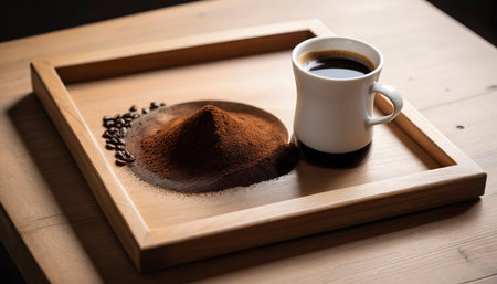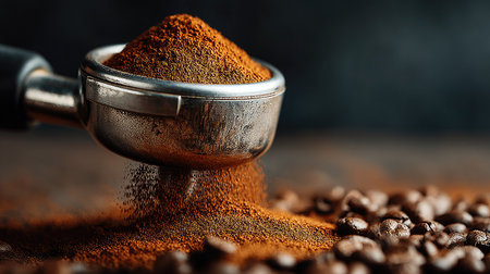 A captivating close-up image depicting freshly ground coffee dust cascading from a grinder. This scene captures the essence of brewing, surrounded by rich coffee beans.