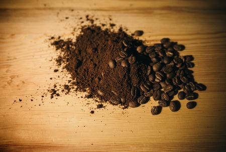 Roasted grains of arabica coffee on the surface of ground coffee.