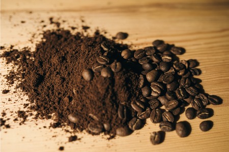 ground aromatic fragrant coffee with spoon texture macro beans background