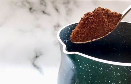 A beautiful silver teaspoon with a portion of ground coffee in it lies against a background of scattered fragrant coffee. Instant coffee in the morning. An invigorating drink that gives energy.