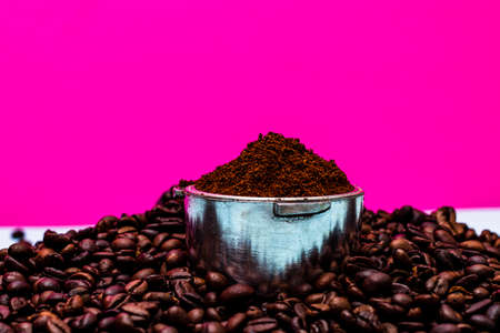 Coffee beans and portafilter with ground coffee in a composition on a pink background.