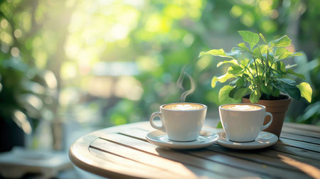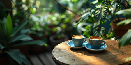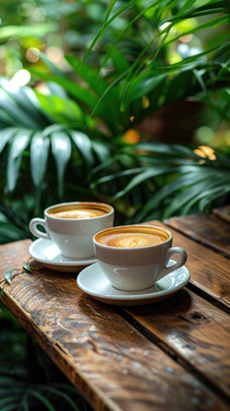 Two cups of coffee on a wooden table in a tranquil garden create a peaceful atmosphere among green plants